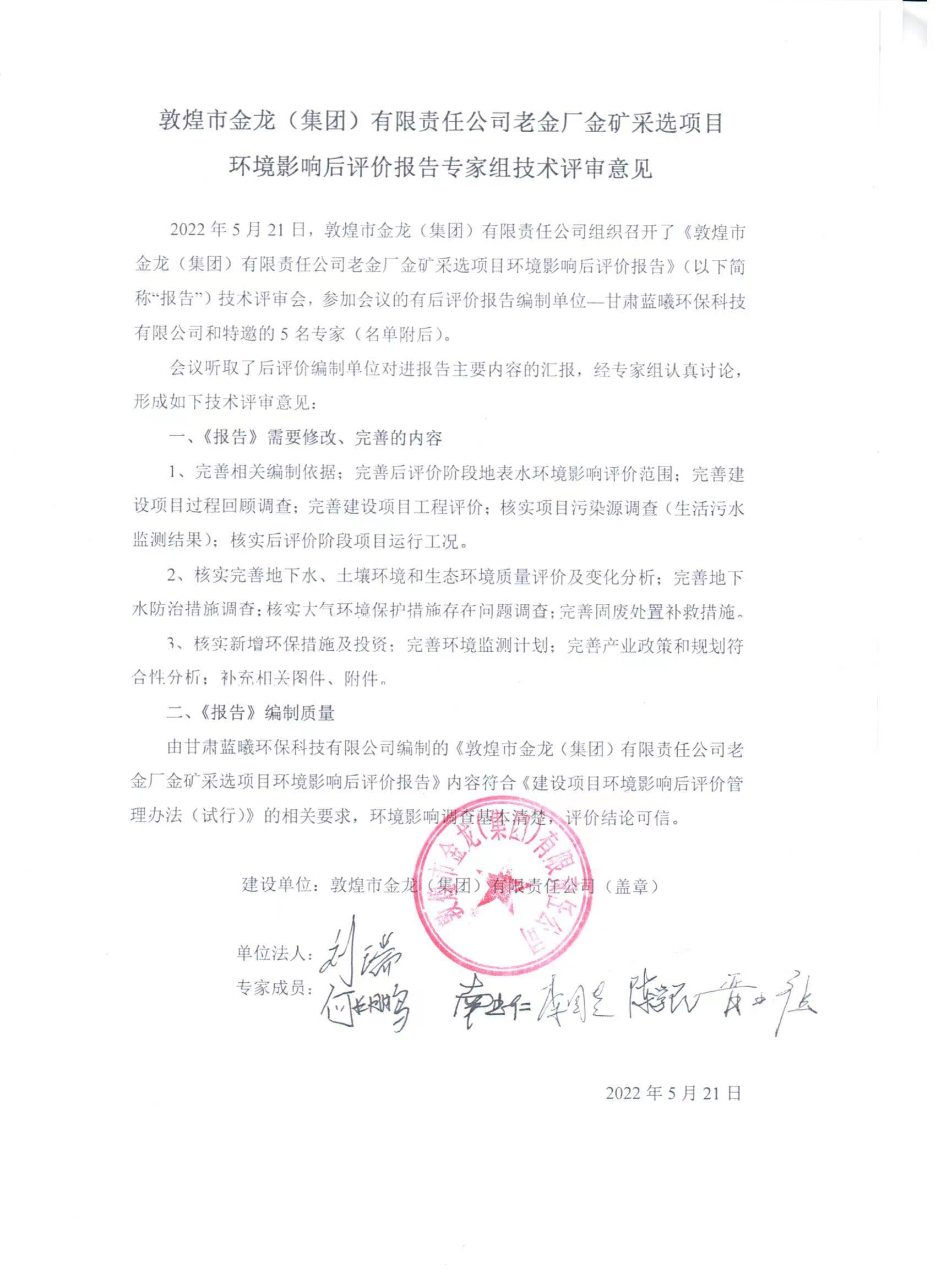 根據(jù)《建設(shè)項目環(huán)境影響后評價管理辦法(試行)》的有關(guān)要求,敦煌市金龍(集團)有限責任公司委托甘肅藍曦環(huán)??萍加邢薰揪幹仆瓿闪恕抖鼗褪薪瘕垼瘓F)有限責任公司老金廠金礦采選項目環(huán)境影響后評價報告》并通過審查。