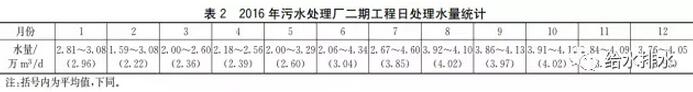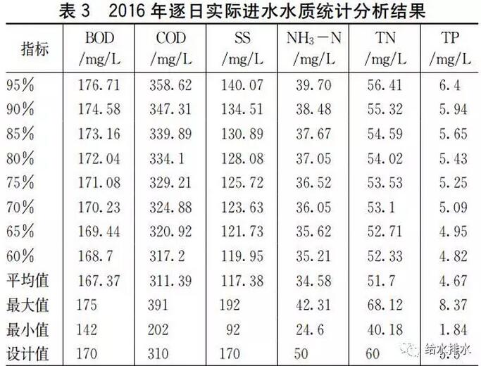 2016年該廠二期工程處理水量統(tǒng)計(jì)分析見表2,進(jìn)水水質(zhì)統(tǒng)計(jì)結(jié)果見表3。