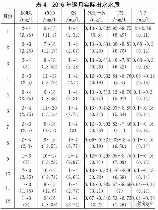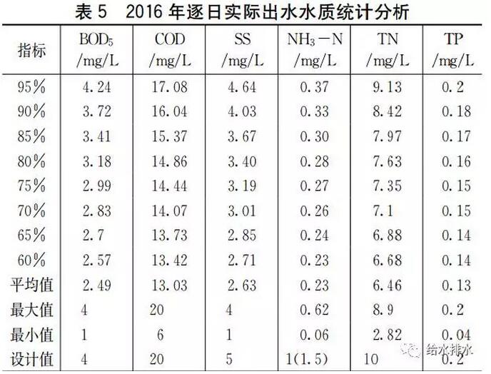 工程2016年逐月實(shí)際出水水質(zhì)見表4;對(duì)2016年逐日實(shí)際出水水質(zhì)進(jìn)行數(shù)理統(tǒng)計(jì)分析,結(jié)果見表5。